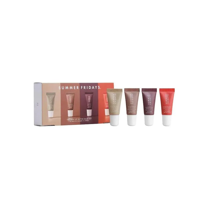 The Summer Fridays The Mini Lip Butter Balm Set is a collection of four mini-sized lip balms that provide long-lasting hydration and nourishment to the lips. This set includes four different flavors: Vanilla, Vanilla Beige, Iced Coffee, and Brown Sugar, each with its own unique scent and sheer tint.